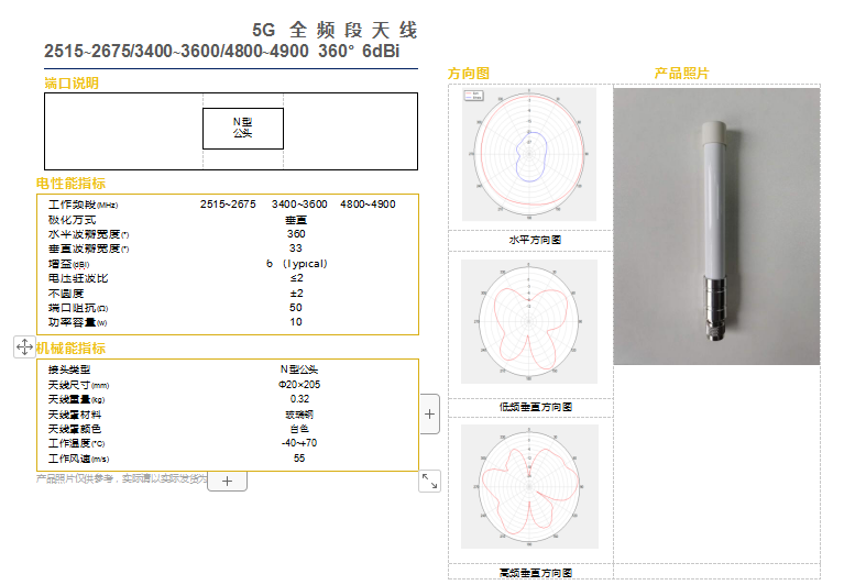 2020年公司最新研發(fā)5G天線產(chǎn)品發(fā)布,技術(shù)特點:增益6dB,水平波瓣寬度:360°,垂直波瓣寬度:33°,駐波比≤2,不圓度:+-2,端口阻抗:50歐姆,功率容量:10W,N型接頭。...
